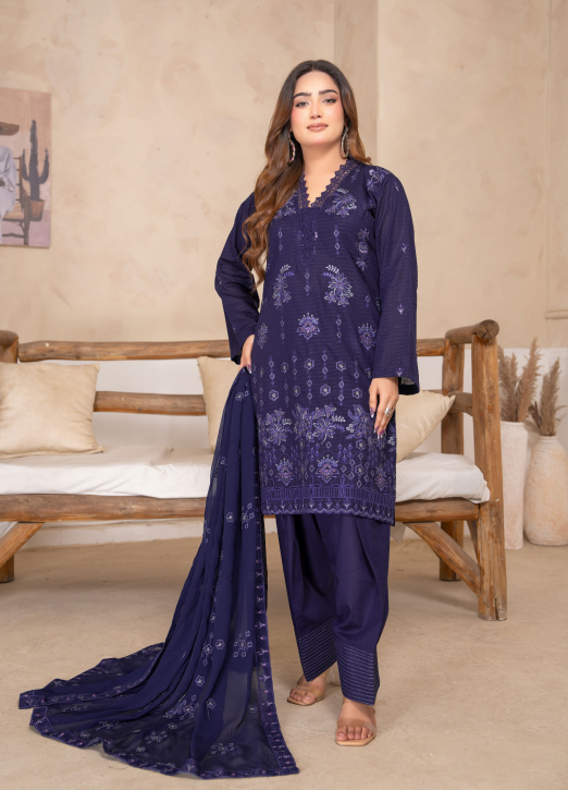 The Alif By Eman Arts Vol 23 Design-04 is a timeless expression of elegance, featuring intricate embroidery on a rich navy-blue base. Crafted for women who appreciate sophistication and comfort, this premium 3-piece unstitched lawn suit is ideal for festive occasions and refined summer wear.