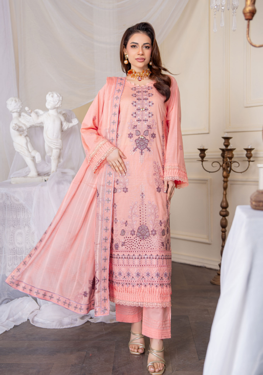 The Alif By Eman Arts Vol 50 Design-04 exudes graceful elegance with delicate embroidery set on a soft peach base. Designed for women who love refined details and timeless charm, this premium 3-piece unstitched lawn suit is perfect for summer days, festive gatherings, and semi-formal occasions.