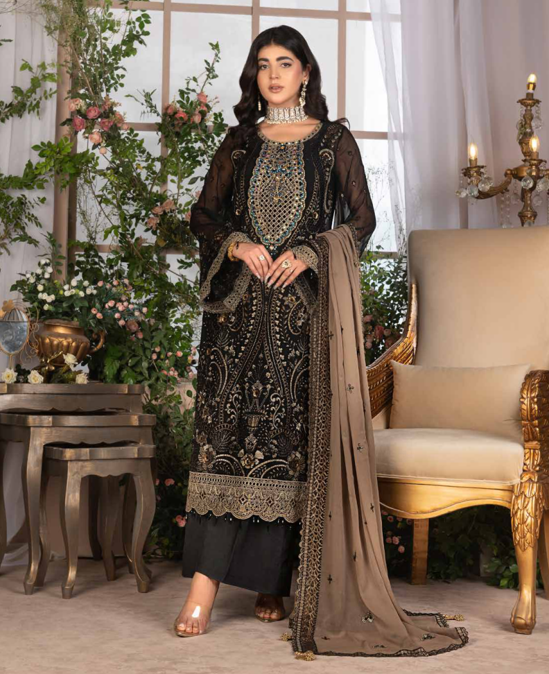 Unveil elegance with JJ Embellished Vol 06 Design 07 Black exquisite embroidered chiffon and organza outfit, crafted for occasions where sophistication takes center stage. The intricate embroidered front and back chiffon pieces are paired with a beautifully embellished neckline, while the organza sleeves and ready-to-wear dupatta add a touch of opulence. Complemented by a raw silk trouser, this ensemble is a perfect blend of luxury fabrics and fine detailing, ensuring you stand out at any formal event. Discover all collections of JJ Clothing at Ittefaq Cloth house.