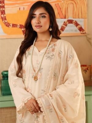 Features delicate floral embroidery on premium lawn fabric, enhanced with refined neckline detailing and soft lace finishing on sleeves and hem. - Stylish Dupatta with Subtle Prints: