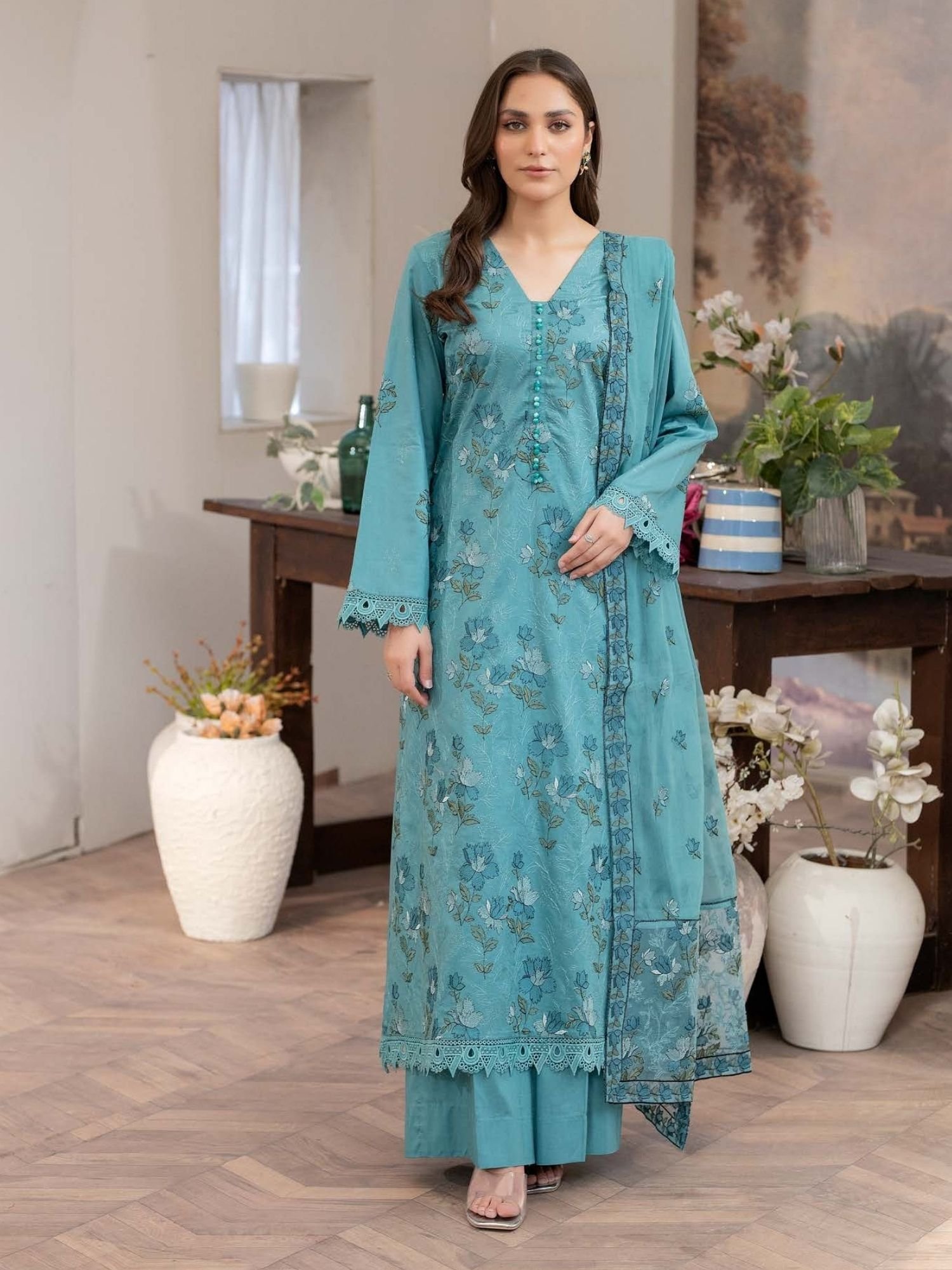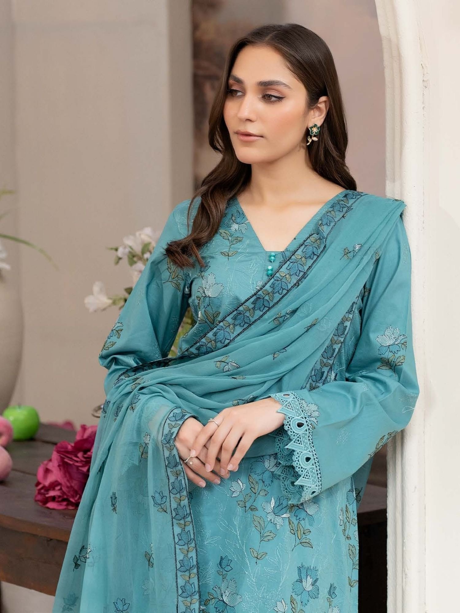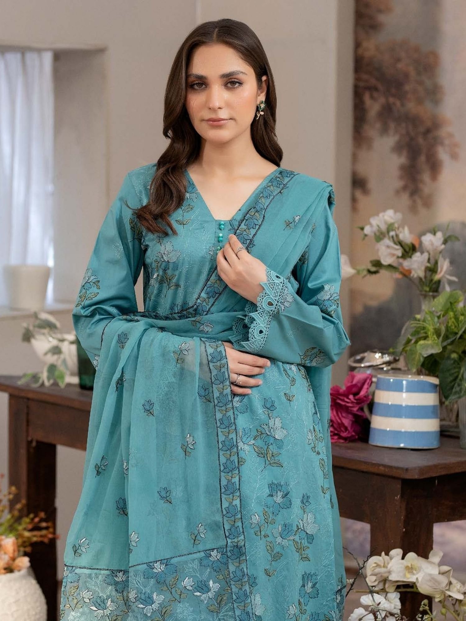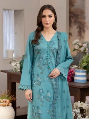 Features intricate floral embroidery on premium lawn fabric, enhanced with a stylish V-neckline and delicate front panel detailing. - Stylish Dupatta with Fine Borders: