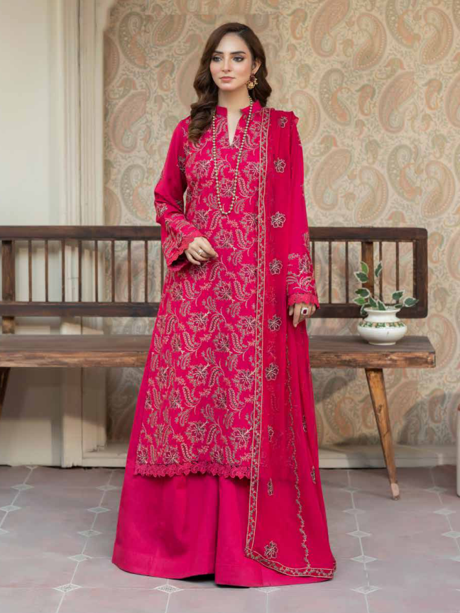 Radiate timeless charm with Noor-e-Fajar Muskan KR-170, an elegant ensemble crafted from plain Karandi fabric and paired with a luxurious Bamber chiffon dupatta. The intricate embroidery adds a touch of finesse to the breathable Karandi, making it perfect for formal or festive settings. This outfit balances tradition with modern aesthetics, ensuring you make an unforgettable statement.