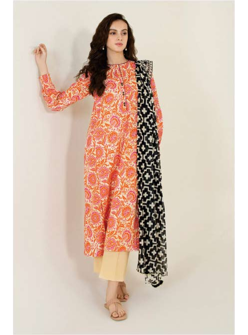 Elevate your wardrobe with Sapphire’s unstitched 3-piece lawn suit, featuring a printed lawn shirt, a printed voile dupatta, and dyed cambric trousers.