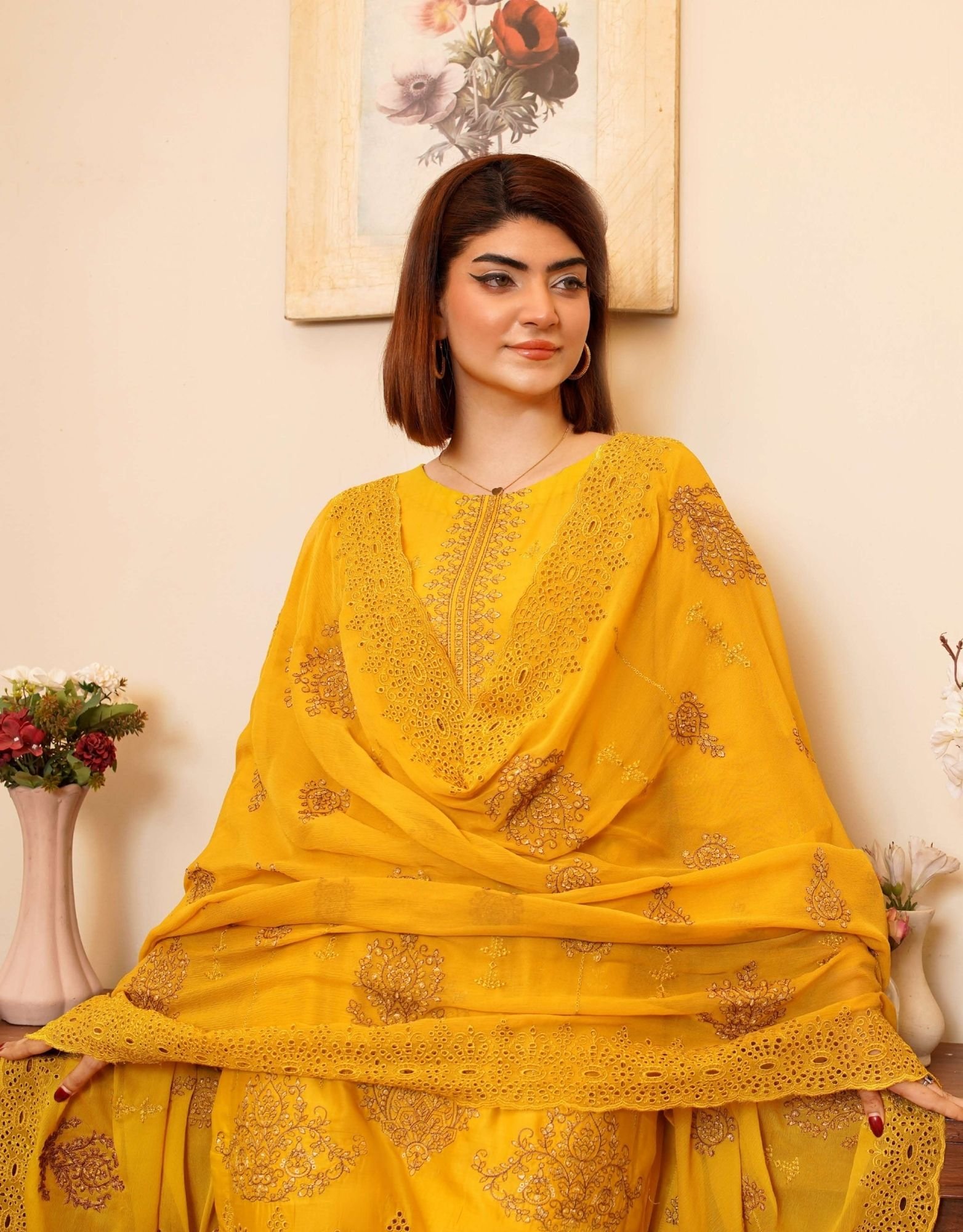 Lightweight embroidered lawn dupatta that adds flow, richness, and balance to the overall outfit. - Dyed Trouser for Everyday Comfort: