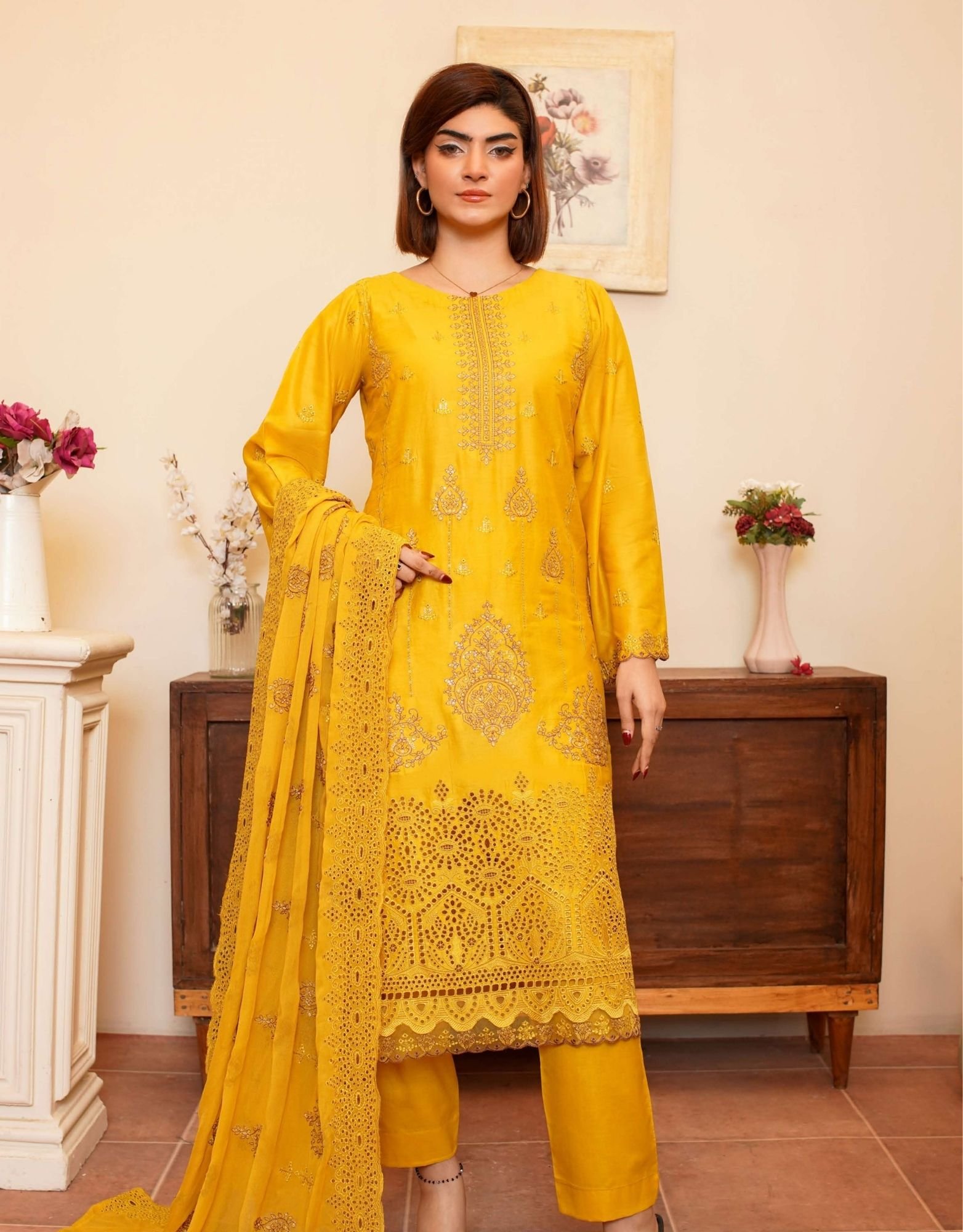 The Shaista Festive Lawn Summer D-6 brings radiant charm with intricate embroidery showcased on a vibrant mustard-yellow base. Designed for women who love bold festive hues blended with timeless elegance, this premium 3-piece unstitched lawn suit is perfect for festive gatherings, daytime celebrations, and refined summer styling.