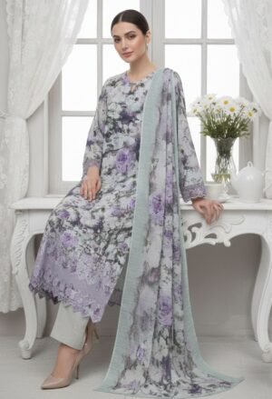 The Shaista Printed Lawn Embroidery No: 510 is a soft and elegant summer ensemble featuring delicate floral prints in soothing grey and lilac hues. Designed for women who appreciate subtle elegance, this premium 3-piece unstitched lawn suit offers a perfect balance of comfort and refined style.