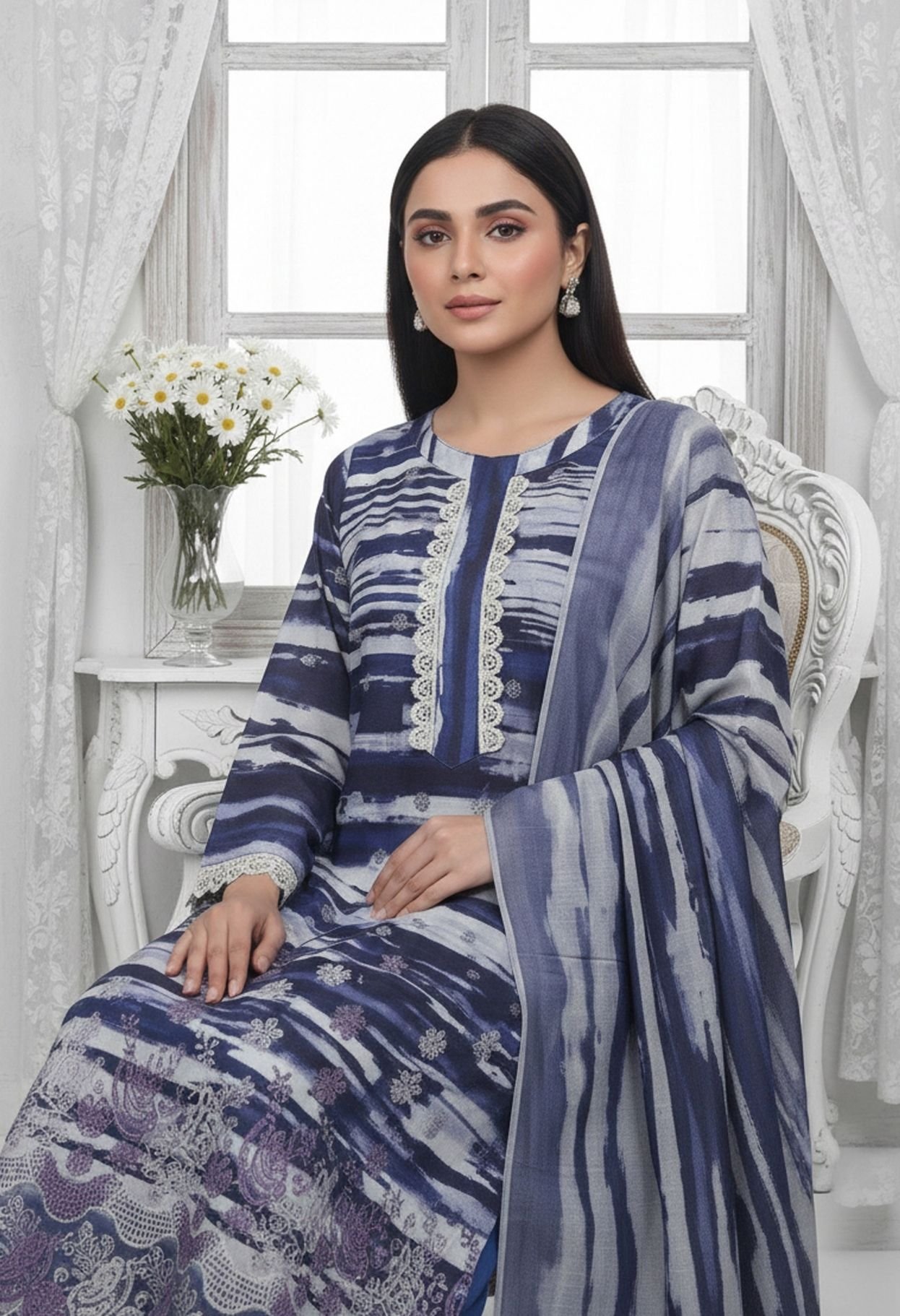 Premium lawn shirt featuring stylish stripe-inspired prints enhanced with subtle embroidery on the neckline and front panel for an elegant finish. - Printed Lawn Dupatta: